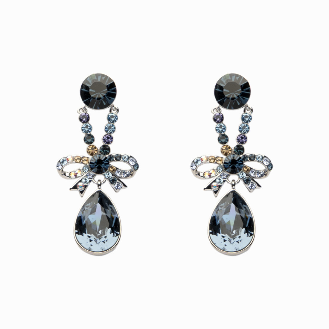 Divu elementu kompozīcija rada vieglu kustību, tāpēc auskari eleganti šūpojas un atspoguļo gaismu no dažādiem leņķiem. Sudrabainā metāla tīrā forma izceļ zilo akmeņu intensitāti un piešķir rotai izteiksmīgu kontrastu.