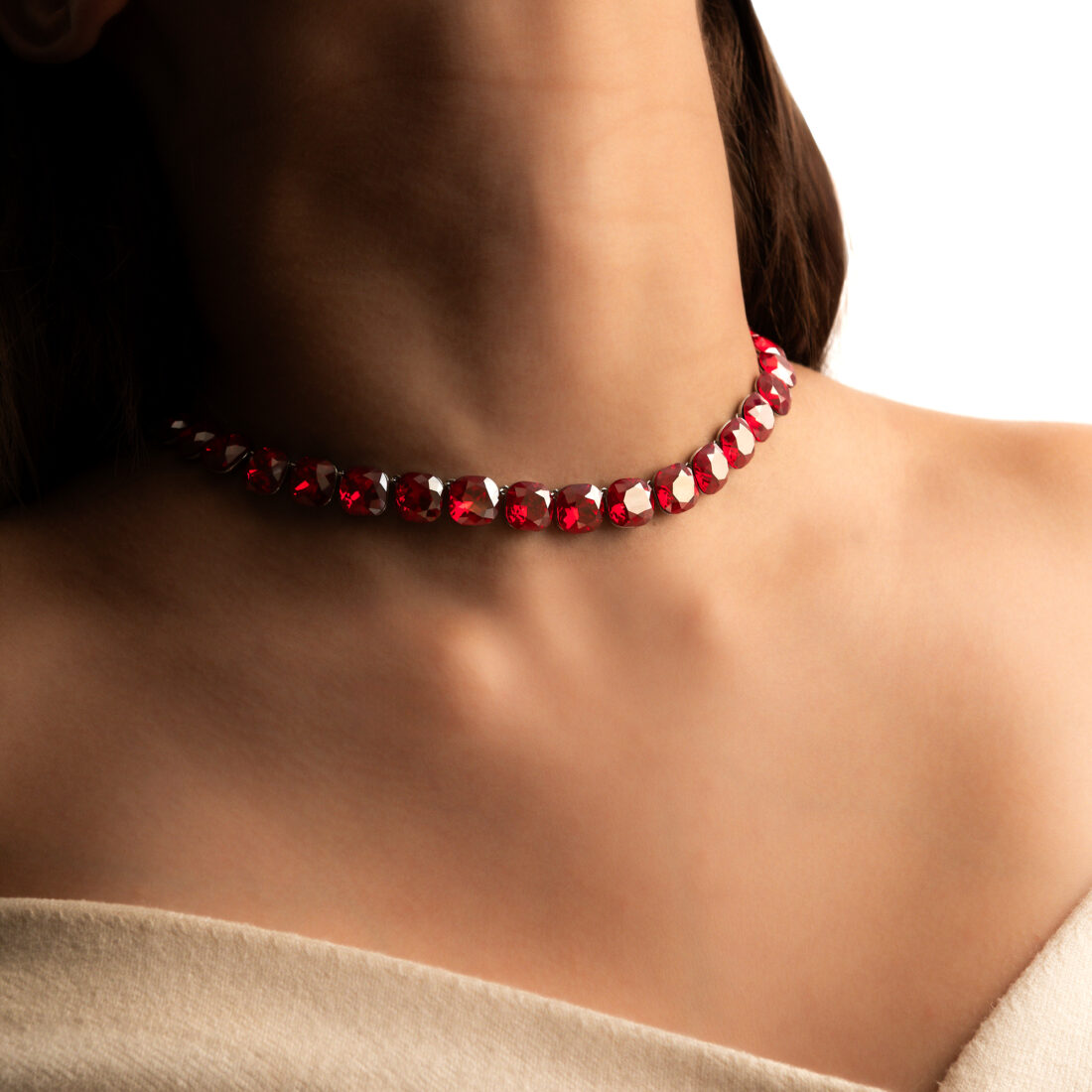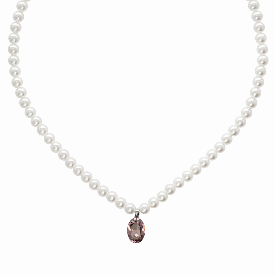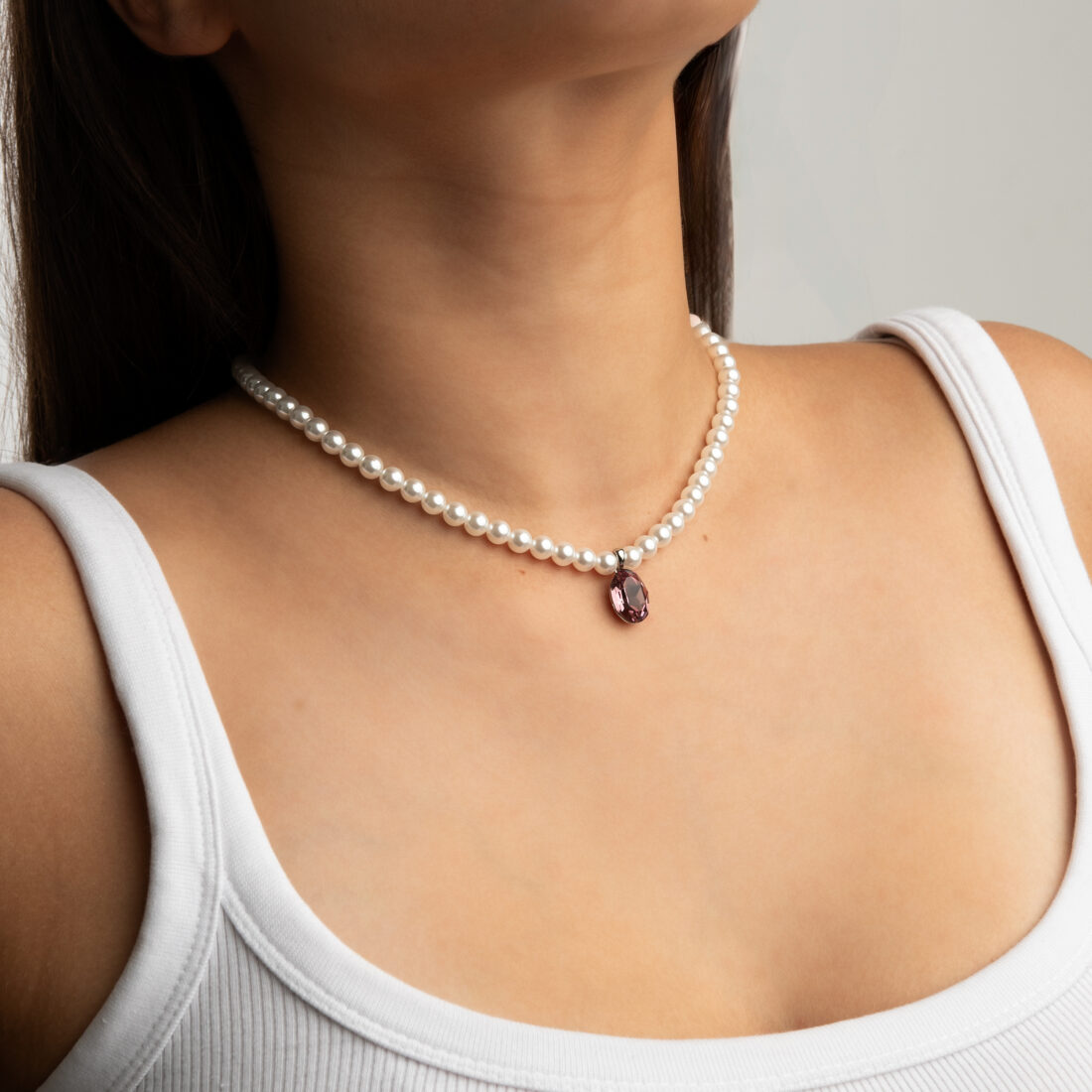 Grezna kaklarota ar sudraba pārklājumu un mirdzošiem kristāliem. Eleganta divkārša ķēde ar iespaidīgu asaras formas piekariņu.