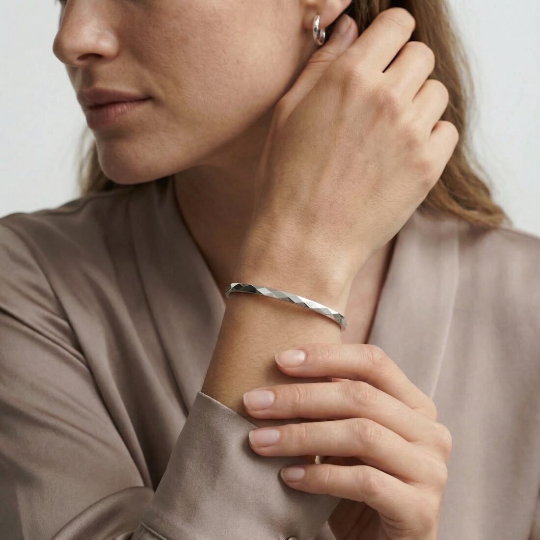 Mirdzoši riņķa auskari ar izteiksmīgu dizainu, kuros galveno lomu spēlē daudzšķautņaini kristāli. To īpašais izkārtojums piešķir rotai apjomu un padara katru auskaru par īstu uzmanības centru. Kristāli skaisti uztver gaismu un rada dzirkstošu efektu, kas piešķir rotai dzīvu un dinamisku izskatu.